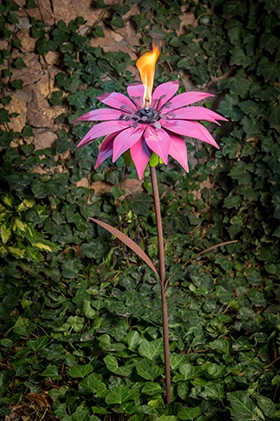 The Bishop Dahlia Torch is made of 100 percent powder-coated steel that is resistant to rust and corrosion and stylized to represent the real flower. The 14-inch-wide by 36-inch-high outdoor torch stakes into the ground and is ideal for outdoor and evening entertaining. A refillable torch canister is included and provides four to six hours of burn time.
