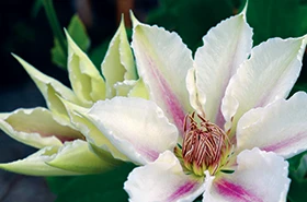 This clematis has white flowers with ruffly edges and a pink/violet stripe on each petal. This compact, heavy bloomer is great for patio containers as well as the garden. It can be grown in full sun to partial shade, grows to a height of 6 feet and blooms June through August.