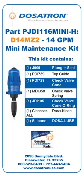 Mini Maintenance Kits for fertilizer and chemical injectors include wear parts, Dosa-Klean, and a new product – Dosa-Lube, and were created for 11, 14, 20, 40, and 100 GPM injectors. The company says that soaking injector parts in Dosa-Klean for 24 to 48 hours cleans rust, mineral deposits and calcifications without scrubbing. Dosa-Lube, a packet of silicone, is designed to lubricate static seals and o-rings while you are changing the wear parts.