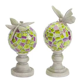 Add an elegant accent to the garden with these polystone dragonfly and butterfly ball statuaries. The mosaic ball design is beautiful in sunlight, yet has a glowing presence even when placed in the shade. Each has a unique blend of tiles in bright hues of green and purple.