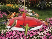The Happy 8 Hummingbird Feeder from Droll Yankees features a snap-fit cover that makes cleaning easy. It has UV-stabilized acrylic construction that will last for several seasons. It is BPA free and safe for Hummers. The ruby-red top provides a natural attraction for hummingbirds with removable feeding port flowers. There are eight feeding ports in all.