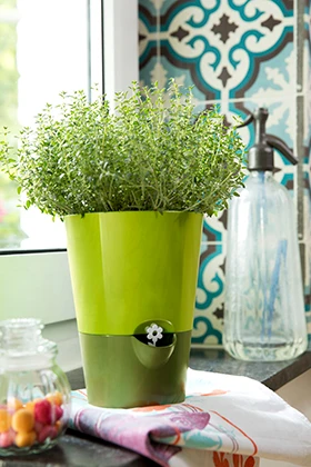 Made of sturdy plastic, the Emsa Smart Planter features an interlocking top and base. The top, which has drainage holes on the bottom, serves as a cachepot for a smaller pot. It is 5.5 inches in diameter and 7.5 inches high. The top fits into the base, which has an opening for adding water. A little flower that floats on the surface of the water is visible through the opening. When the water level is low, the flower drops: just water the flower through the opening to make it rise again. There is no need to disassemble the planter to add water. The planter comes with a 100 percent cotton wick and a spiral pin for inserting and positioning the dampened wick in the soil. The wick extends into the base, where it will naturally draw up water as needed to keep the roots comfortably moistened. Because the Smart Planter maintains a reservoir of water in the bottom, plants can be watered less often. Available in green, pink or white, the planter has a suggested retail price of $16.95.