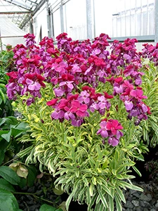 Erysimum ‘Honeyberry’ features intense magenta purple blooms that when mature become a soft mauve. Variegated foliage ages from gold to cream, and provides a backdrop to the blooms. It has an upright habit, and the flower color is most intense when grown cold (40°F – 45°F). Suitable for one- or two-gallon production, it is a showy early-season offering.
