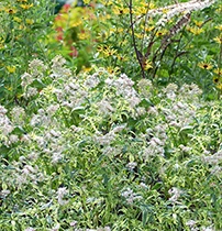 Eupatorium ‘Capri’ is a new dwarf variegated eupatorium that grows well with others in containers and in the garden. It has frilled feather-like foliage that is emerald green, lined with soft cream and kissed with pink and rose. Tiny lavender-pink flowers bloom mid-summer, perfect for attracting butterflies. This variety requires average soil as well as sun and partial shade for maximum performance. The average size is 18 inches wide and 21 inches tall with a 24-inch flower height, and it grows well in Zones 4 to 8.