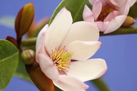 'Fairy Magnolia Blush' is a new hybrid of Michelias bred to produce masses of beautiful fragrant flowers blushed with lilac-pink in early spring. These plants are so free flowering that they have a flower bud at each leaf axil and have been known to provide a light flush of flowers during summer, too. The plants are bushy with rich evergreen foliage, which makes them ideal in the garden as a flowering hedge or specimen plant.