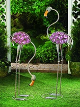 Modern Miami styling comes to life with this duo of glowing glass and metal statues. Each sculpture weighs 4 pounds. The wrought iron and glass bead birds are 41 and 30 inches high. Some assembly is required.