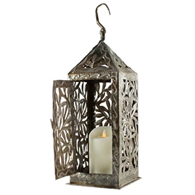 Made from recycled steel oil drums, this hanging lantern is handcrafted by artisans in Haiti under fair trade standards. It is 14 inches tall and the base is five inches square, with a hinged door and latch. Multiple holes in bottom for drainage. Varnished for outdoor and indoor use. Each is signed by the artist.