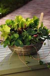 A fresh - and edible - mixed container, featuring a mix of lettuce blends and sweet strawberries. Delectable indeed!