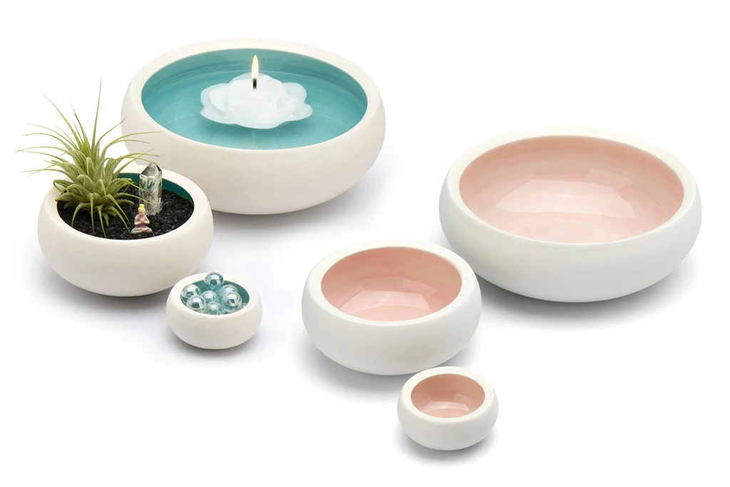 The Color Spots collection features pots in varying sizes (6-inch, 4-5/8 inch, and 2-inch) in bright colors to enhance the greenery or colored sands/gravels they accompany. Featured colors are a bright yellow, light blue, turquoise, lime green, light pink, and light purple.