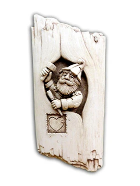 This little gnome peers out from a hollow in a tree trunk and has just finished carving a heart in it. To Gnome Me is to Love Me measure 5.25 inches by 11 inches and weigh 3.5 pounds. He is available in the following Patina washes: Natural, Aged Stone, Designer White, Green and Terra Cotta. His suggested retail price is $40