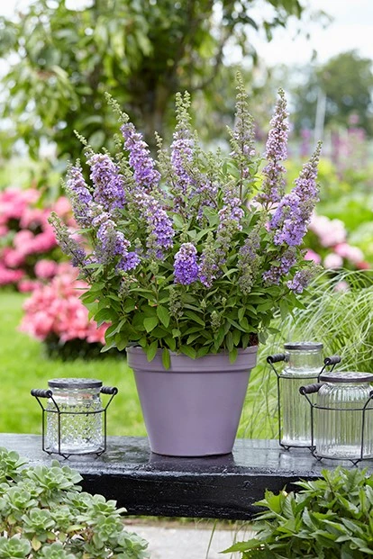 Buddleija ‘High Five’ is a dwarf selection that will produce flowers when the plant is only 8 inches tall. Large double purple blooms will appear summer through fall. This is a non-invasive variety that produces little to no seed, and has dense growth habit. Available in 3-inch liners.