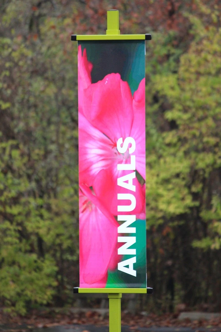 This new sign system accommodates signs of a quarter inch of rigid material and pole pocket banners. Options include wall-mounted systems, portable units and brackets for mounting on our quality shade structures. Take your sign and graphics program to new heights with our versatile sign hardware systems. Please visit our website and go to "Sign Solutions" to find new ways to improve your signage program. 317-402-8400. Made in the USA.