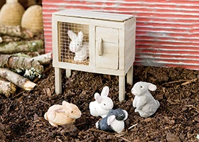 Jeremie’s new Bunny Hutch and Bunnies are full of personality and make charming additions to miniature gardens. Hand-crafted Hutch comes with one white bunny and stands 3.25 inches high. Top lifts for easy access. Bunnies are sold separately in sets of 4 — each different to “hop” into your heart.