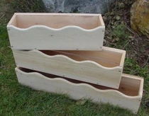 The Maine Bucket Company markets beautiful scalloped cedar window boxes. They are made of northern white cedar with brass screws and available in three sizes: Item No. 570 is 24 inches ( 24"W x 7.5"H x 9"D ), Item No. 571 is 30 inches ( 30"W x 7.5"H x 9"D ), and Item No. 572 is 36 inches (36"H x 7.5"H x 9"D). These window boxes are easily stained or painted, but they also will weather to a beautiful silver gray, if left in their natural state. They are also available with a stained finish. Each box comes with a cleat hanger mechanism (no brackets are necessary), and the rot-resistant cedar allows for direct planting with no liner necessary.