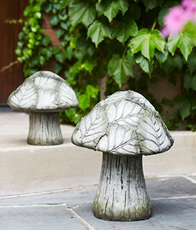 Place this set of mushrooms in the garden for extra texture and interest among your plants. Each polystone mushroom has a hand-carved look with a leafy pattern accented in a mossy green color, adding to their woodland charm. Mushrooms are 8 inches wide by 12 inches tall.