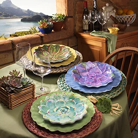 Commissioned art work adorns unique flower shapes that are patterned after popular succulents found in today’s home decor and artistic landscaping. Hues of lavender and mint mix and match with solid color dinner plates in periwinkle, buttercup, and mocha.