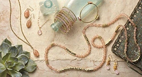 CURIA, Midwest-CBK’s debut jewelry brand, features nearly 200 exclusive, boutique-inspired and hand-crafted designs, including pieces embellished with semi-precious aqua or coral chalcedony stones, crystals or black onyx. The 12-inch rose chalcedony gold plated teardrop necklace featured in the photo and coordinating dangle earrings are made of 18-karat gold plated brass and semi-precious rose chalcedony stones. The sorbet bead and wire drop earrings, 20-inch sorbet bead and wire drop necklace, gold wire and pink beaded bracelet, pink and sorbet triple bead bracelet and 50-inch sorbet and gold beaded necklace are made of brass and beads.