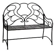 The Garden Bench with Angel Wing Design from Midwest CBK is made of durable iron. It measures 39.75 inches L x 18.75 inches W x 35 inches H and comes in two colors: distressed cream and matte black (pictured).