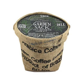 The Garden Sack is a kitchen garden kit that includes all the growing necessities for three culinary herbs, and features a self-watering container hidden inside an upcycled burlap coffee bean sack. The kit includes a reservoir container, smart pot, soilless grow medium, polypro wicks, water measuring gauge, organic plant food, seeds, starter cubs, upcycled coffee bean sack, simple instructions. The sack measures 6.5 inches high by 7.5 inches in diameter. Suggested retail price is $40.