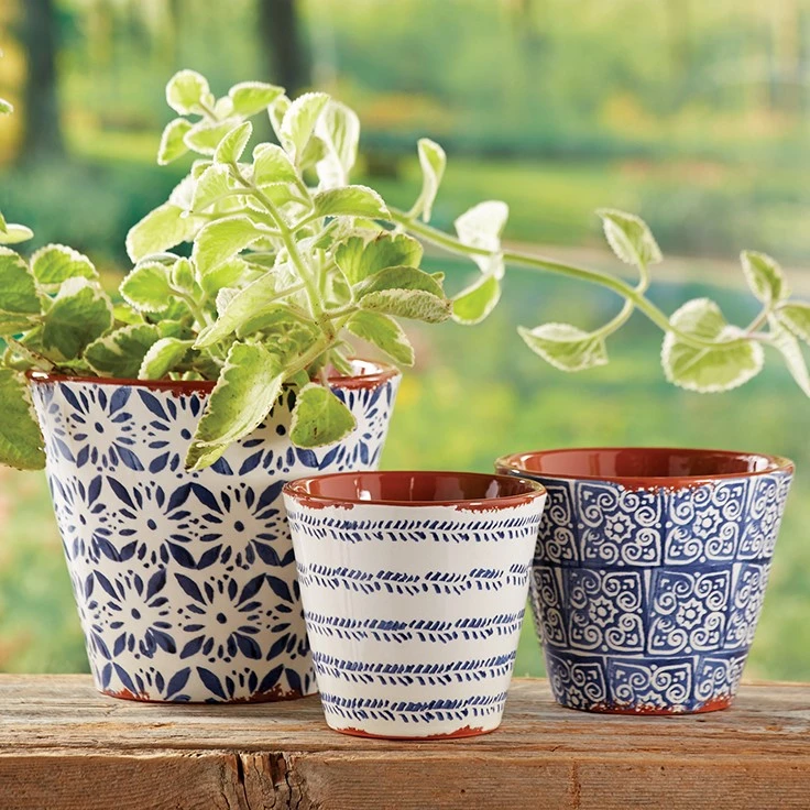 Glazed terracotta pot features hand-stamped pattern exterior and natural glazed terracotta rim and interior. Garden Accessories Planters/Stands/Trellis Misc Garden Products Containers