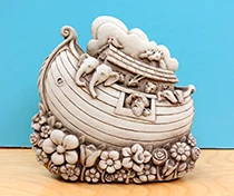 Noah and his ark ride a wave of blooms in Noah’s Garden Ark by George Carruth. Made of hand-cast stone, the piece is weatherproof and comes in five patinas: natural, aged stone (pictured), designer white, green and terra cotta. The statue is freestanding and comes with a hook on the back for hanging. Suggested retail is $40.