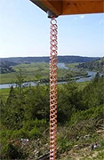 Oregon Garden Art's handmade copper and aluminum rain chains feature an elegant, intricate design that looks good on any style of house. They're great for cold climates and windy locations because they don't blow around or collect heavy ice. Choose copper for a traditional look, or aluminum for lighter weight and lower environmental impact. Chains come with a gutter hanger, a gutter outlet adapter, and instructions.