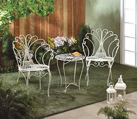 This peacock-inspired, iron bistro set comes with two chairs that feature swirling iron tendrils, and a round table with a flower design and four curled legs. Set weights 26.6 pounds. Table: 19 3/4 inches by 19 3/4 inches by 21 5/8 inches high; chairs: 25 1/4 inches by 24 1/2 inches by 36 inches high.
