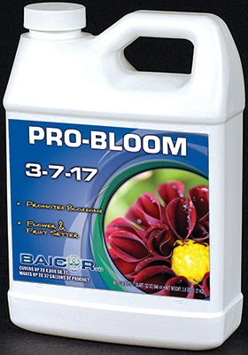 Pro-Bloom provides ingredients to enhance blooming of flowers and fruiting of fruits and vegetable; 3 percent Nitrogen, 20 percent phosphorous, 17 percent potassium and chelated micronutrients are available to enhance growth and development. Plants with high levels of phosphorus have an increased tolerance to many stress conditions; phosphorus levels help plants recover from injury more rapidly. There are also reports that phosphorus plays a key role in reducing disease infections. Potassium has many roles in the plant including the opening and closing of stomata; this is particularly important in providing nutrient uptake through the leaves.