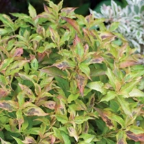 My Monet Sunset Weigela from Proven Winners ColorChoice is a new dwarf weigela that has very attractive gold foliage and nice red fall color. My Monet Sunset features variegated, yellow and green leaves with hints of red, pink and orange. These colors intensify as the fall progresses, but do not burn or revert. Grown primarily for its colorful foliage, it will occasionally produce soft, rosy pink flowers. My Monet Sunset will be widely available in garden centers in Spring 2012.