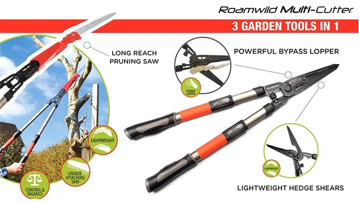 The Roamwild Multi-Cutter is three garden tools in one:Long reach pruning sawPowerful bypass lopperLightweight hedge shears Tools & Equipment