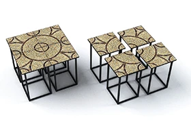 Designed for entertaining outdoors, the new Saldanha Split Side Table can also transition indoors. The four-piece glass mosaic all-weather tables fit together in perfect harmony to create a versatile surface. Arrange all four tables together for a 28-inch square coffee or end table. Separate them for use as individual 14-inch square accent or cocktail tables. Create several different mosaic patterns by arranging the four table’s different ways. Tables are a comfortable 20 inches high for optimum use.