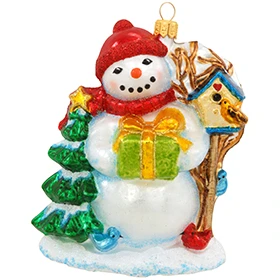 This 4.5 inch tall ornament features a snowman holding a gift and nestled next to a bird perched on a bird feeder. The ornament is made in Poland and retails for $26.99.