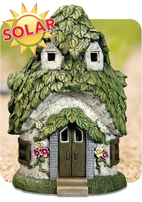 Exhart’s new Solar LED Cottages come in nine unique designs. Pictured is Exhart’s Leafed Roof design that stands 14 inches tall. The detailed windows and doors illuminate, providing a realistic look and glow at night. Each design is hand painted and made with durable all-weather resin. The amorphous solar panel captures the sun’s energy during the day to illuminate multiple LED lights each evening.