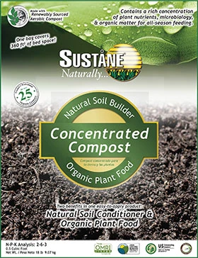 Suståne Concentrated Compost 2-6-3 All Natural Organic Soil Builder is the latest addition to Suståne Natural Fertilizer’s professional-grade, organic offerings for the home gardener. A natural soil conditioner and organic plant food in one, it replenishes soil with a rich supply of stabilized organic matter, microbiology, and essential nutrients required for quality plant growth. Suståne Concentrated Compost is approved for organic growers and can be used to enhance garden soils, potting mixes, raised bed media, and to rebuild damaged or depleted soils.