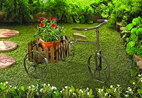 This faux tricycle will pedal its way into your customers' hearts and homes with country charm. The wooden basket is framed with picket fence posts and is ready to display potted plants.