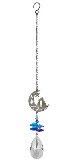A large crystal is topped by smaller crystals & silver cats and moon. Held sacred by ancient Egyptians, cats symbolize mystery and watchfulness. These cats admire the moon together above a cluster of crystals that sparkle and shine. Sun streaming through the crystals fills your room with rainbows. Works equally well as a sun catcher or Christmas ornament. Hang it in your office or dorm room it's especially beautiful when hanging in the window or in front of a light. Not boxed, instead it comes with a sheer organza gift bag. Recommended for indoor use. Woodstock Crystal Suncatchers they do for light what our chimes do for sound. "