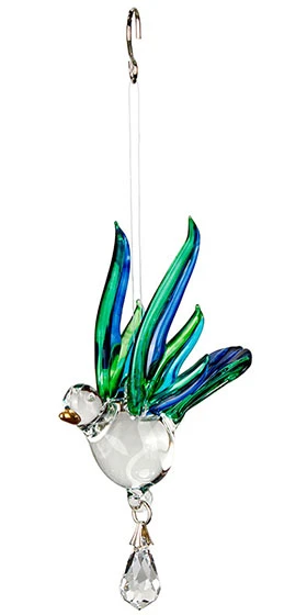 Songbirds are protective spirits associated with music. Hand painted in peacock blues and greens, this hand-blown glass bird tops a genuine Austrian crystal that sparkles and shines in the sun. Comes in a four-color gift box. Works equally well as a sun catcher or Christmas ornament. Hang it in your office or dorm room - it's especially beautiful when hanging in the window or in front of a light. Recommended for indoor use. Woodstock Crystal Suncatchers do for light what our chimes do for sound."