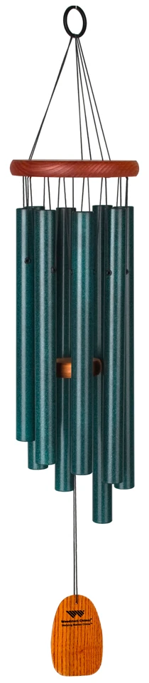 Woodstock Chimes' Waltzing Matilda chime measures 27.5 inches long and features dark verdigris powder-coated aluminum tubes. It has cherry finished ash wood and is tuned to the notes of “Waltzing